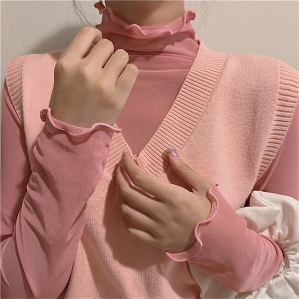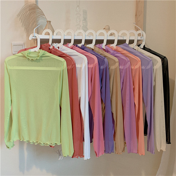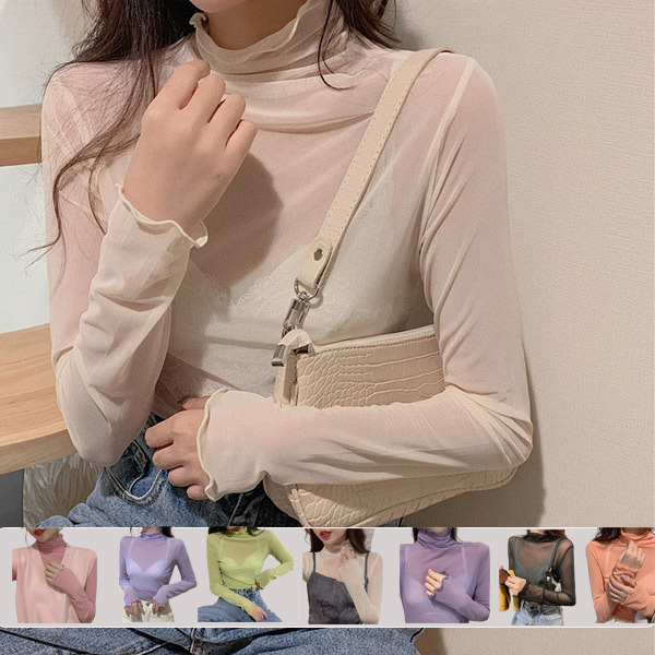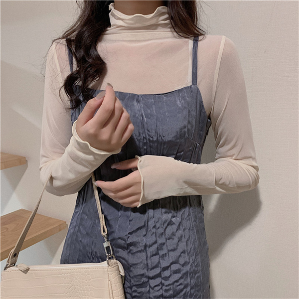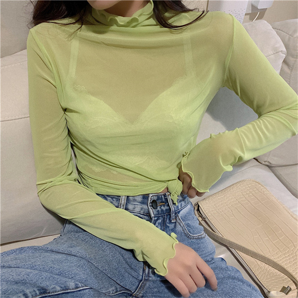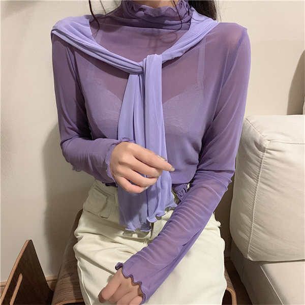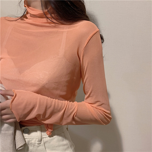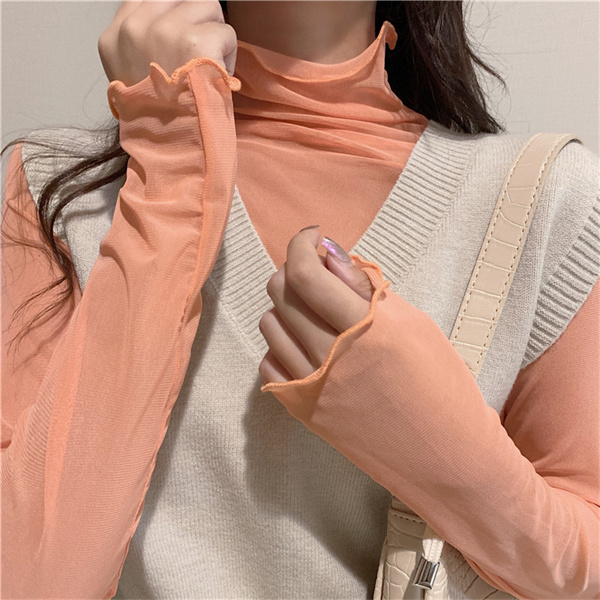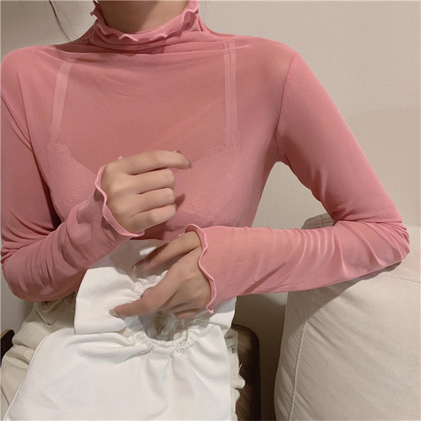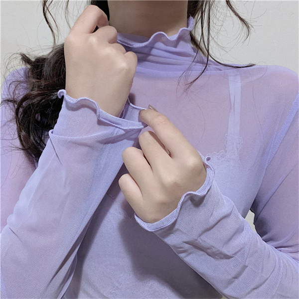 ポイント超超祭利用可 シアートップス フリル カットソー レディース レース インナー シャツ ハイネック タートルネック 透け感 重ね着 長袖 薄手 ブラウス チュール