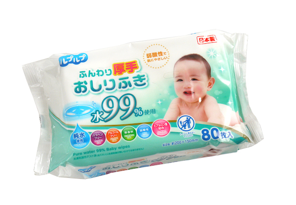 おしりふき ルプルプ 水99%使用 ヒアルロン酸配合 ノンアルコール ふんわり厚手 20×15cm 80枚入 (100円ショップ 100円均一 100均一 100均)