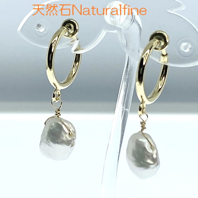 こちらは、ケシパールのフープイヤリングです。 形が自然に形成されたバロック クレオで球体ではなく楕円をクシャとつぶしたような形で、その凹凸が光にあたると美しく輝きます。
