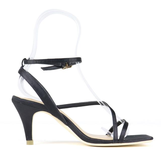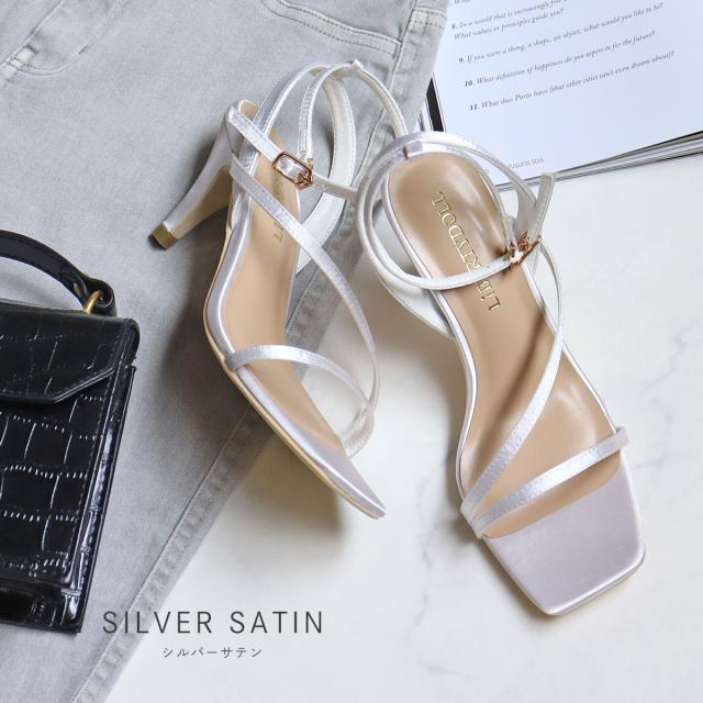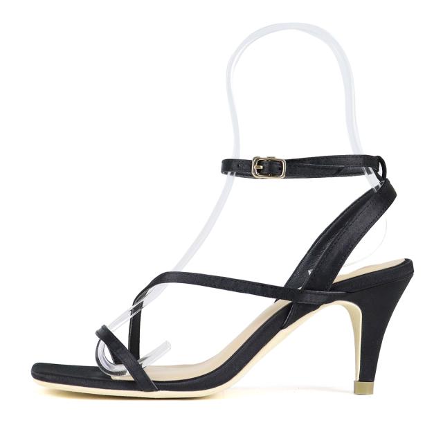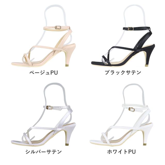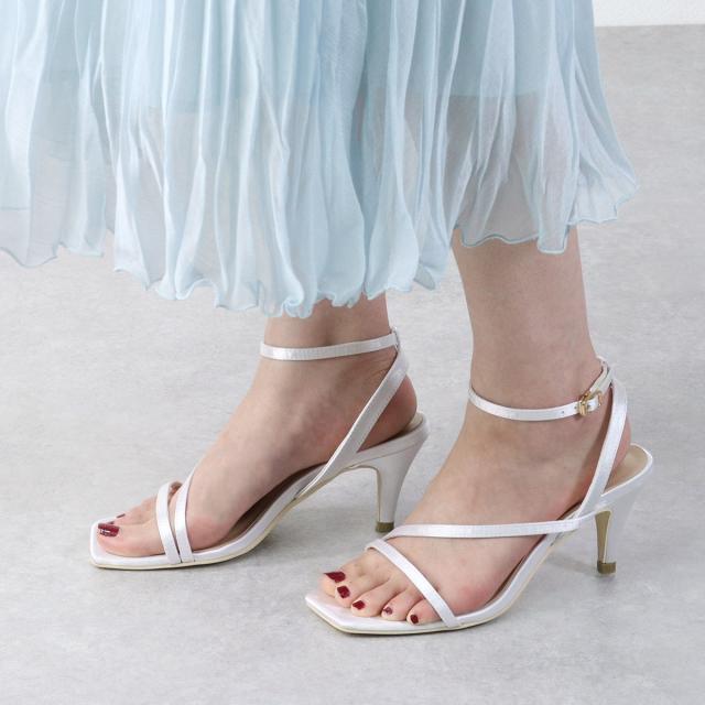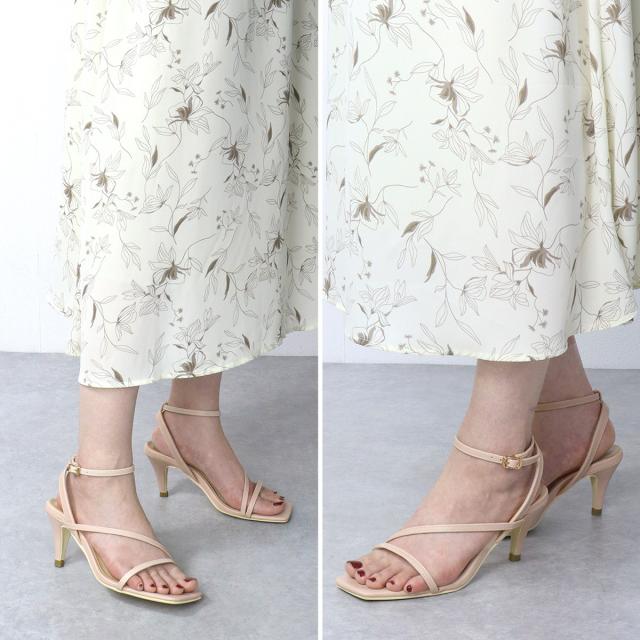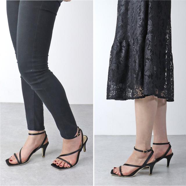 細めのナローストラップとアシメデザインで華奢見えが叶うストラップサンダル。
