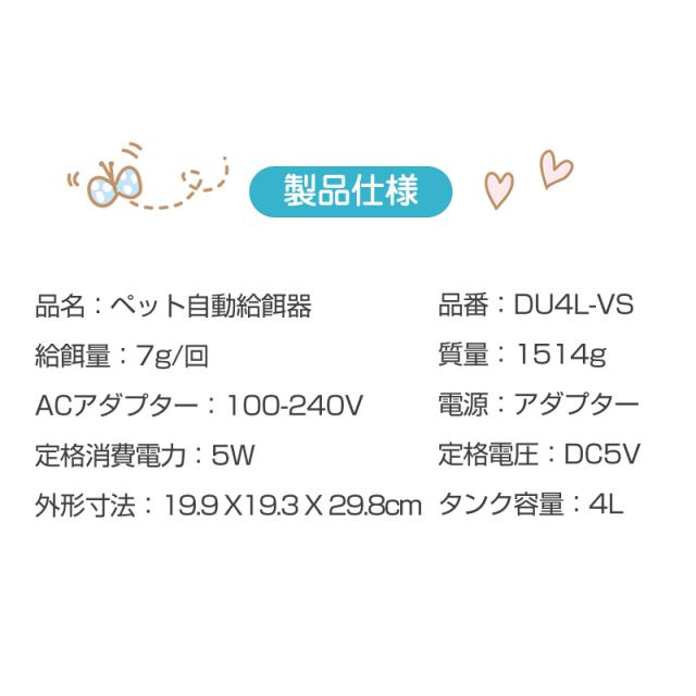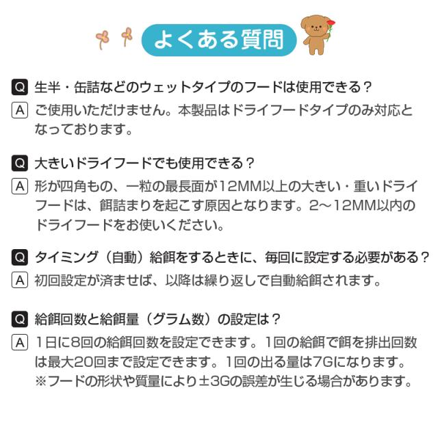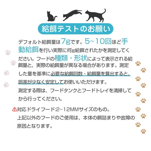 1回の給餌量 :1回の給餌で餌を排出回数は最大20回まで設定でき、1回の出る量は約7gです