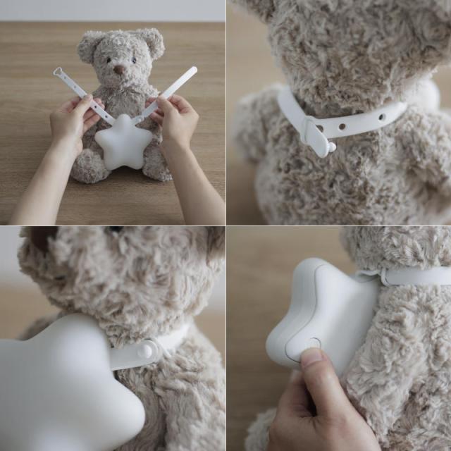 えほんライトには、柔らかいベルト素材が付いており、お子さまのお気に入りのぬいぐるみに付けることができます。