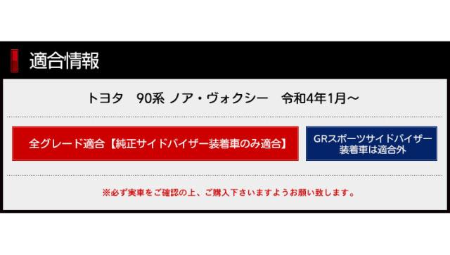 | 適合 | トヨタ ノア ヴォクシー 令和4[2022]年1月〜 純正バイザー装着車 ※GRスポーツバイザー装着車は適合不可 |