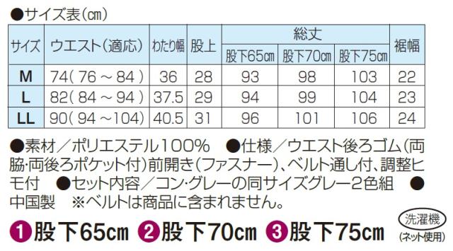 ●仕様/ウエスト後ろゴム、両脇・両後ろポケット付、前開き(ファスナー)、ベルト通し付、調整ヒモ付