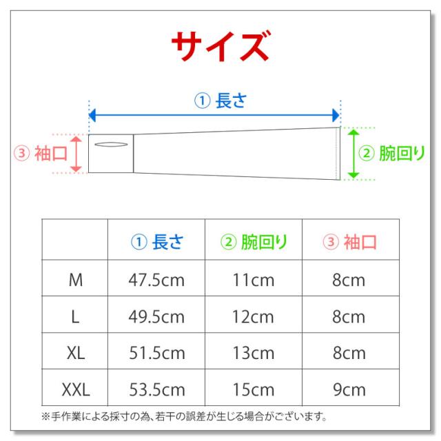 XXLサイズ:長さ53.5cm、腕回り15cm、袖口9cm