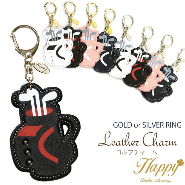 【メール便対応】Happyチャーム -38 本革 牛革 ゴルフ ゴルフバッグ 鋲付き レザー シンプル プレゼント ギフト キーリング 日本製 贈り物 ハッピー バッグ 可愛い 上品 コンペ 景品 ゴールド シルバー ネームプレート┃