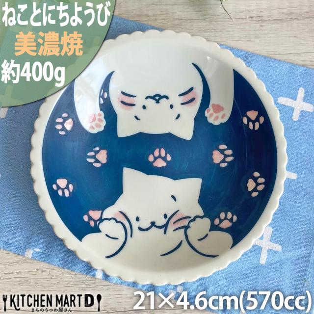 ねことにちようび 21.0cm 六三深皿 約400g 美濃焼 和食器 大皿 パスタ皿 カレー皿 丸 猫 ネコ ねこ インテリア 猫好き かわいい おしゃれ プレート 皿 国産 日本製 カネ定製陶 陶器 食器 食洗機対応 ラッピング不可