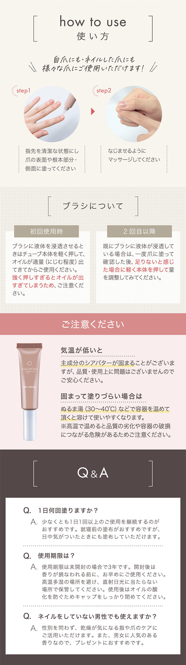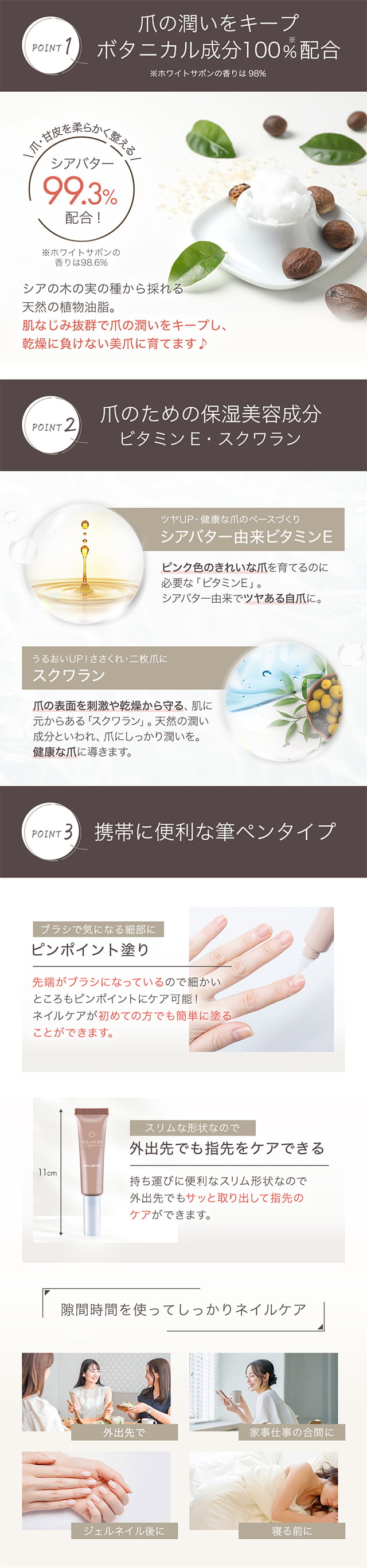 【関連キーワード】ネイルオイル ネイルセラム 爪 ケア 美容液 オイル 補修 保護 シアバター 爪割れ ひび割れ ささくれ 割れ爪 二枚爪 甘皮 キューティクルオイル ネイルケア 爪 の 補強 剤 プチファム シアバター スクワラン 美容成分 ジェルネイル 痛んだ爪 乾燥 キューティクル トリートメント オーガニック 植物性油脂 爪美容液 天然成分 艶 ネイル美容液 育爪