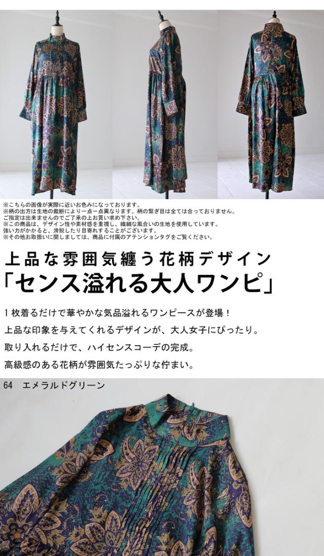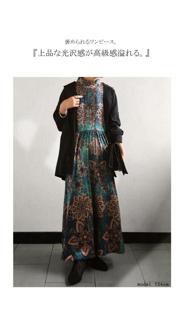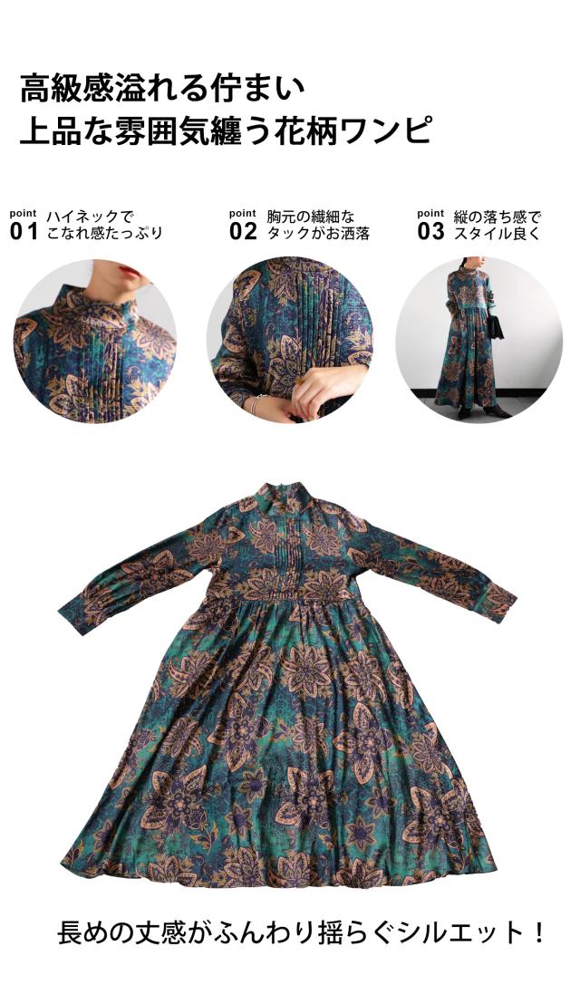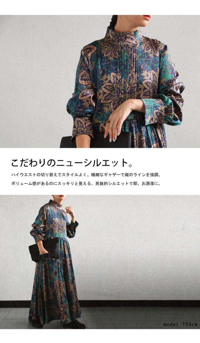 py-00615 ロング 長袖 ハイネック 柄ワンピ 柄 タック ギャザー 切替え ハイウエスト 上品 華やか 高級感 光沢 ふんわり Aライン 体型カバー 裏地付き フォーマル オケージョン