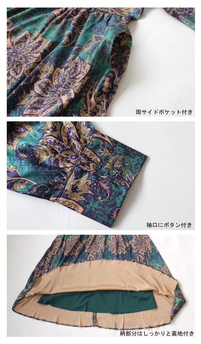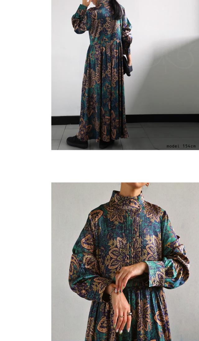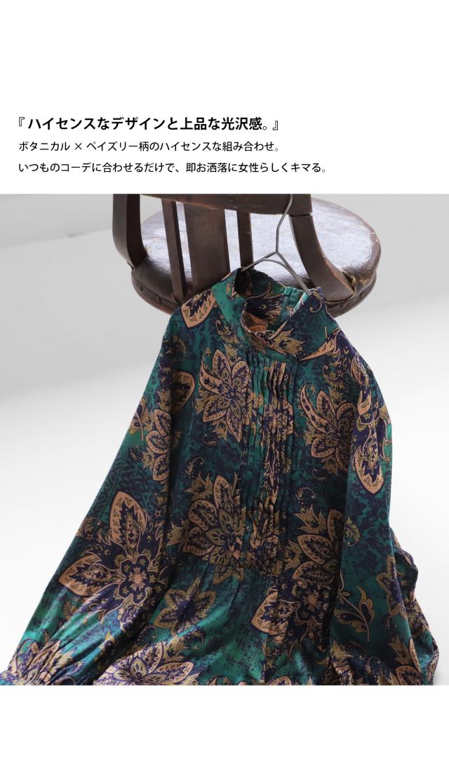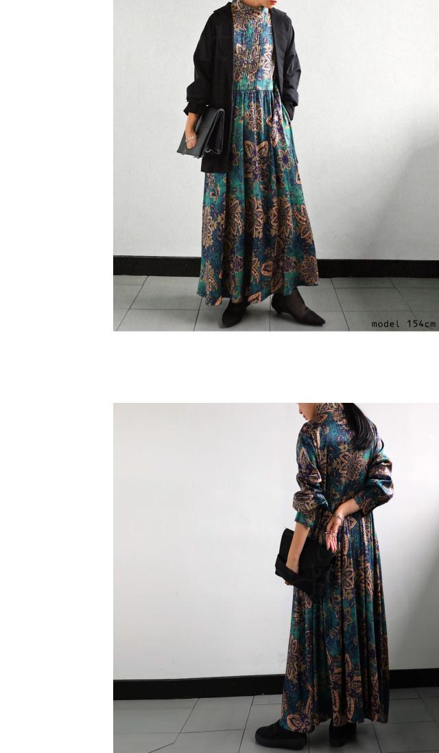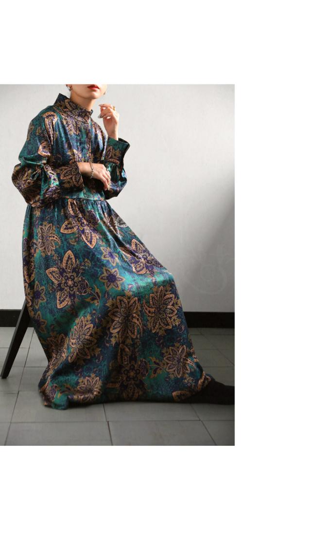 py-00615 ロング 長袖 ハイネック 柄ワンピ 柄 タック ギャザー 切替え ハイウエスト 上品 華やか 高級感 光沢 ふんわり Aライン 体型カバー 裏地付き フォーマル オケージョン