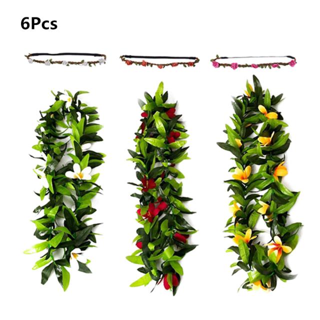 6ピース/セットハワイ人工葉リースコスチュームパーティー小道具装飾アクセサリー(3リース+ 3ヘッドリング)