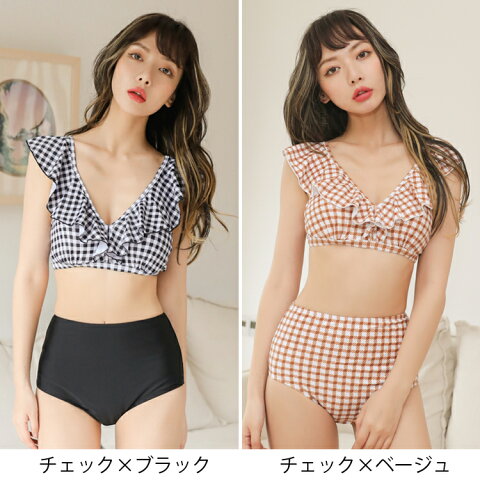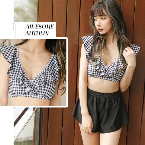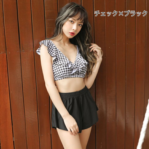 水着 レディース 体型カバー ビキニ 大きいサイズ 3点セット パッド付き セパレート ショートパンツ ハイウエスト ギンガムチェック 無地 黒 ラッシュガード 女子 韓国 シンプル フィットネス水着 ぽっちゃり カバーアップ 体系カバー 20代 30代 40代 50代 60代