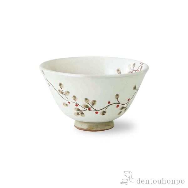 陶器のあたたかみを残しつつ、軽さにもこだわっているお茶碗です。手描きで描かれた絵と絵の具の重なりが優しい雰囲気を醸し出しています。お茶碗と湯呑それぞれ2サイズ展開で販売しています。