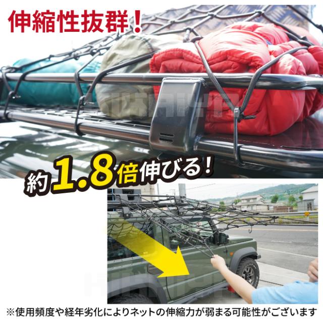 荷物の固定に最適な伸縮性のあるネット! ●車のルーフラックにおすすめの荷崩れ防止・固定用のネットです ●ネットに付属しているフックで引っ掛けるだけの簡単取り付け! ●フックはラバー素材で覆われており、取り付け部分を傷付けません また、サビの発生を防ぎます ●伸縮性抜群! ●持ち運び・保管に便利な収納袋付き! 【ご注意】 ※荷物を完全に固定することはできません 特に網目より小さな荷物はネットから抜け出す可能性があります ※ネットが切れないよう、重量物や鋭利な物を取り扱う際にはご注意ください ※使用頻度や経年劣化によりネットの伸縮力が弱まる可能性がございます 品番:CGN-R |