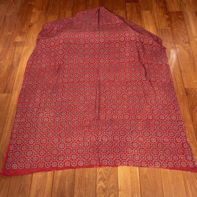 ウッドブロック(木版)を用いて一つ一つ模様を染めこんだ優雅で贅沢な仕上がりの布です。色が変わるたびに版を交換するため非常に時間のかかる丁寧な手仕事の賜物といえます。インドは美しい布の宝庫ですが、その中でも特に素敵な一枚に仕上がっています。