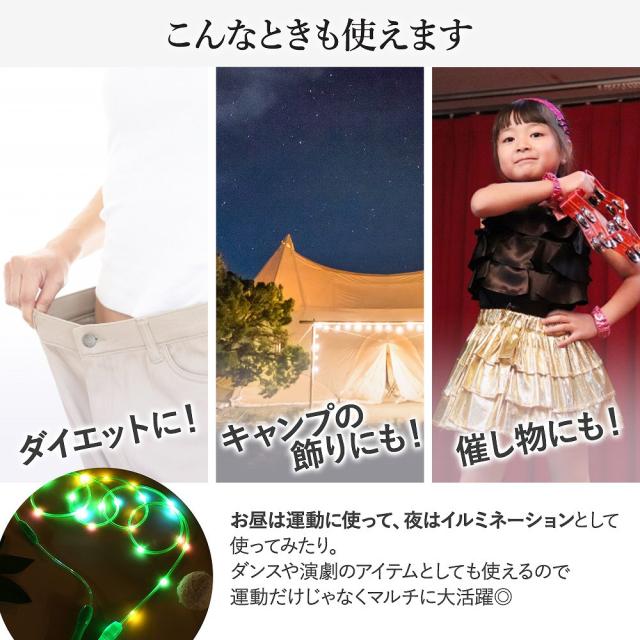 | 商品の説明 | 長引く自粛でおうち時間を退屈しているお子様や、デスクワークでちょっと太った…とお悩みの方も。 楽しくみんなで運動できるのが、今大人気の”縄跳び”なんです。 ロープの部分に、LEDが内蔵されているので飛ぶと光の軌跡が残像となって美しく輝きます。 お昼は運動に使って、夜はイルミネーションとして使ってみたり。 ダンスや演劇のアイテムとしても使えるので運動だけじゃなくマルチに大活躍◎ 消費カロリーは体重によって変わるものですが、平均的に縄跳びを10分間飛ぶと100kcalを消費! 忙しい現代人だからこそ使って欲しい縄跳びなんです◎ あんまり運動が好きじゃない…というお子様でもいつもと違うキラキラきれいな縄跳びなら楽しく喜んでくれること間違いなし。 手軽に運動不足を解消できる、いま人気のストレス解消アイテムです◎ |