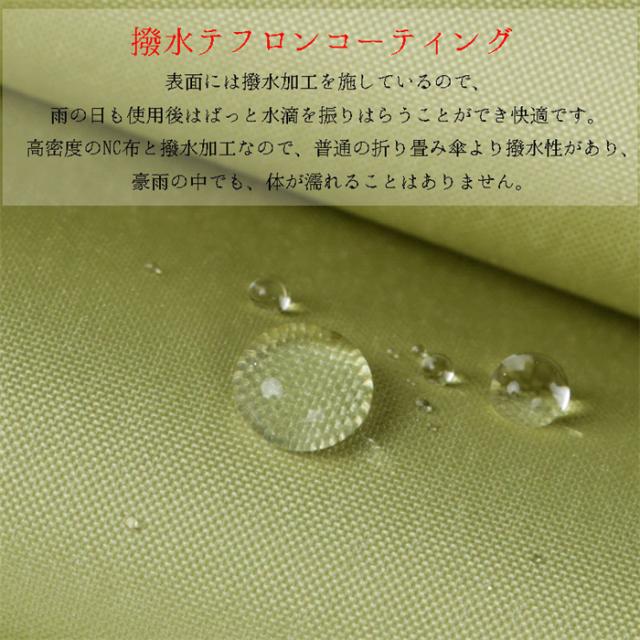 ★超撥水性:高密度のNC布と撥水加工なので、普通の折り畳み傘より撥水性があり、豪雨の中でも、体が濡れることはありません。折りたたみ傘に超撥水のテフロン加工を施すので傘を閉じた後、軽く振るだけで、水滴が簡単に振り払えます。