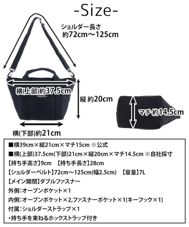 | サイズ(約) ※当店実寸値 | 公式サイズ 横39cm×縦21cm×マチ15cm 自社採寸サイズ 横(上部)37.5cm(下部)21cm×縦20cm×マチ14.5cm 【持ち手高さ】9cm 【持ち手長さ】28cm 【ショルダーベルト長さ】72cm〜125cm(幅2.5cm、取外し可) 【容量】7L | ||