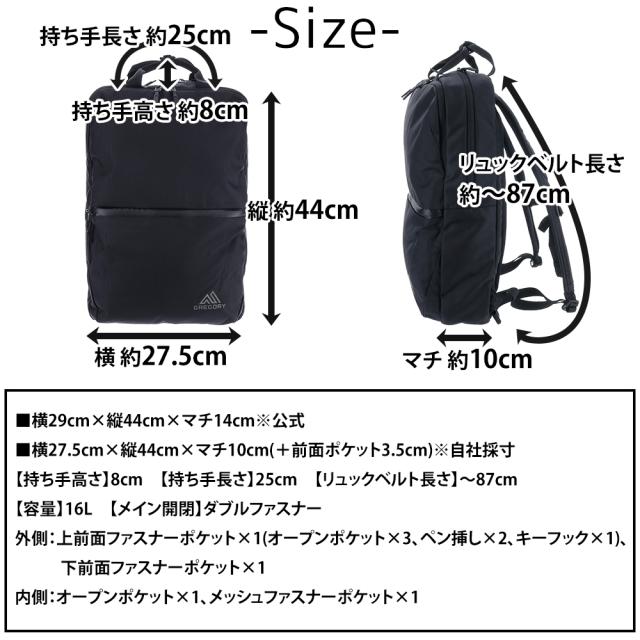 | サイズ(約) ※当店実寸値 | 公式サイズ 横29cm×縦44cm×マチ14cm 自社採寸サイズ 横27.5cm×縦44cm×マチ10cm(+前面ポケット3.5cm) 【持ち手高さ】8cm 【持ち手長さ】25cm 【リュックベルト長さ】〜87cm 【容量】16L | ||