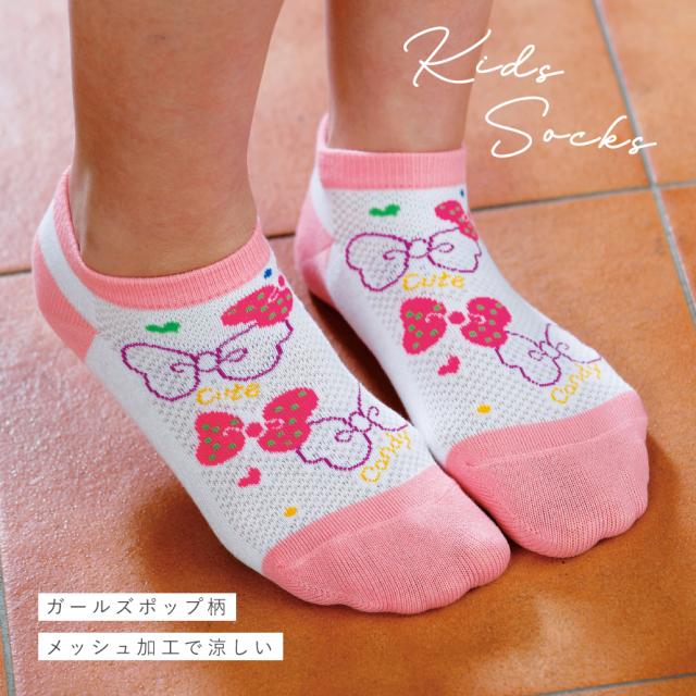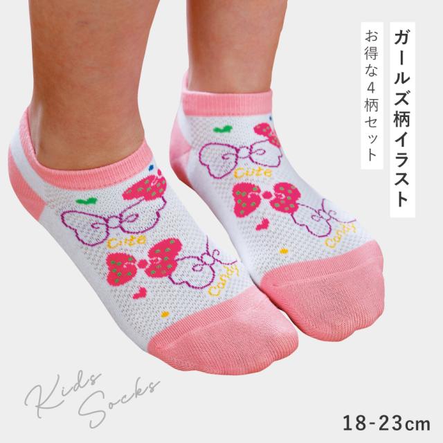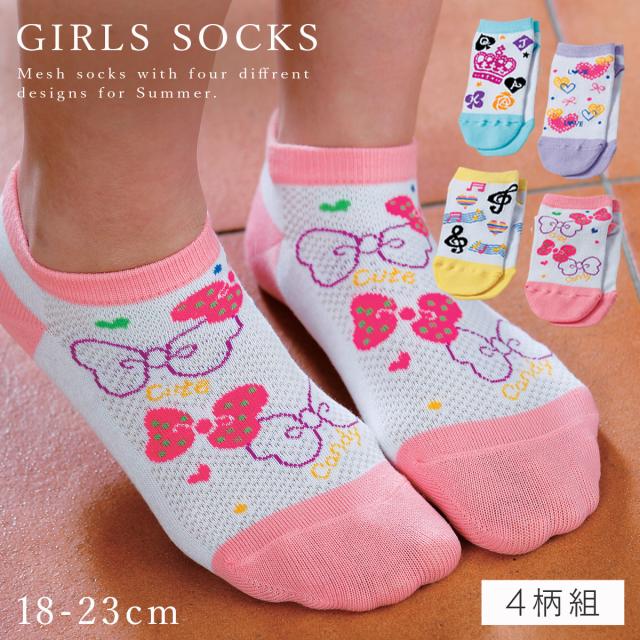 靴下 子供 キッズ 4柄組 18-23cm 女の子 夏用 メッシュ くるぶし 薄手 涼しい かわいい ガールズメッシュポップソックス