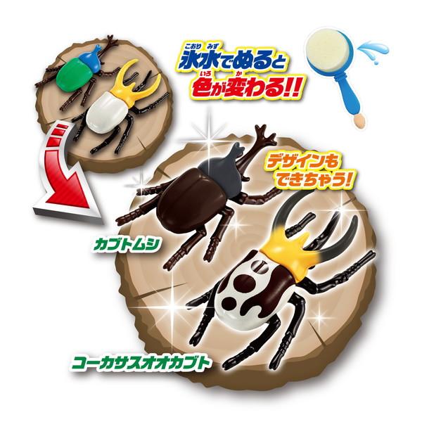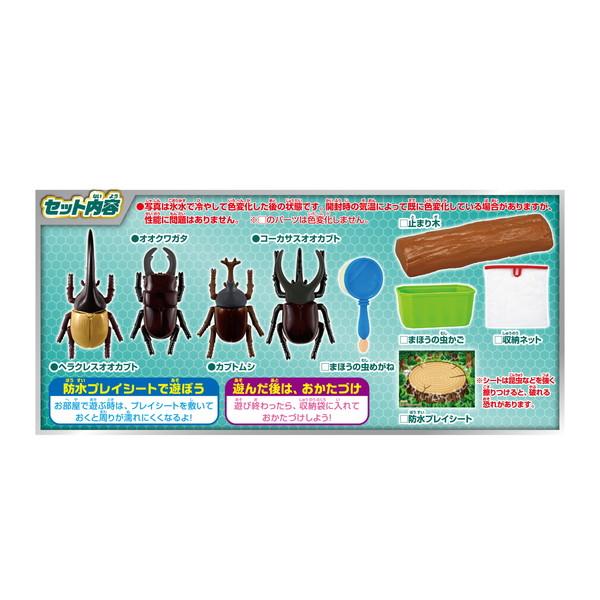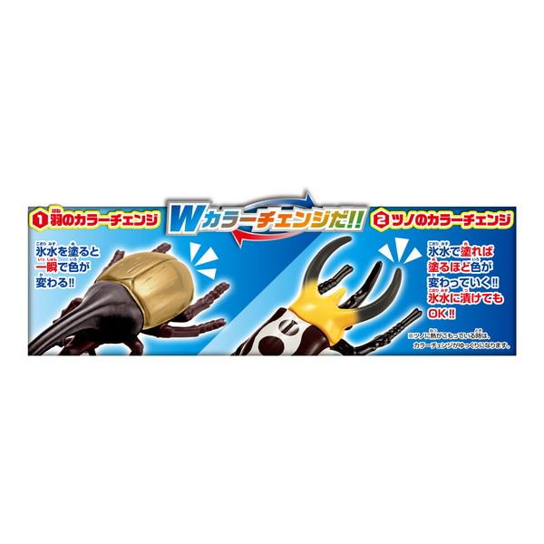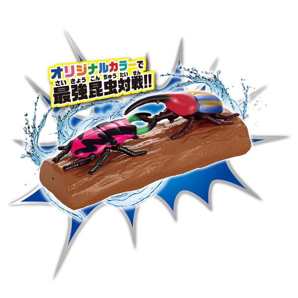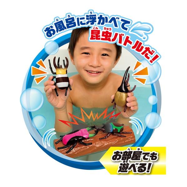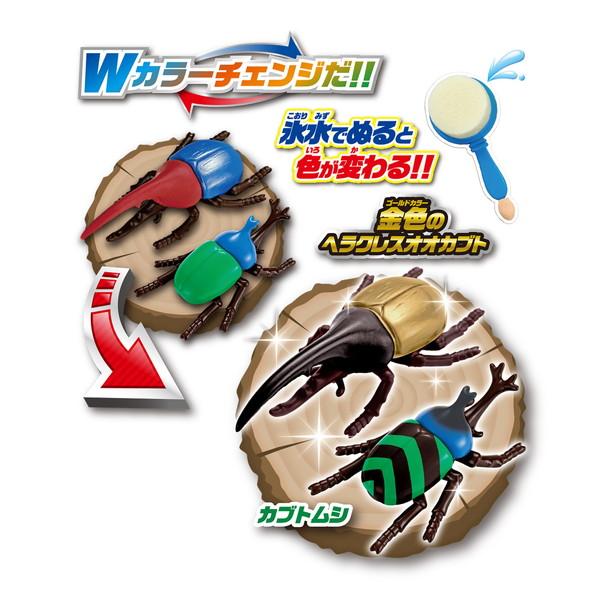 お風呂でもお部屋でも遊べるカブトムシ&クワガタセット。付属の止まり木の上で昆虫対戦が出来ます。ツノと体で異なる色変わりが楽しめる、Wカラーチェンジタイプです。