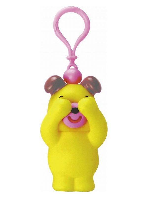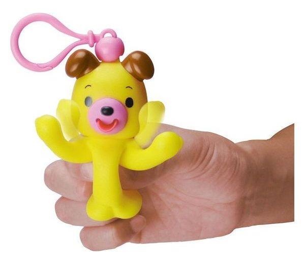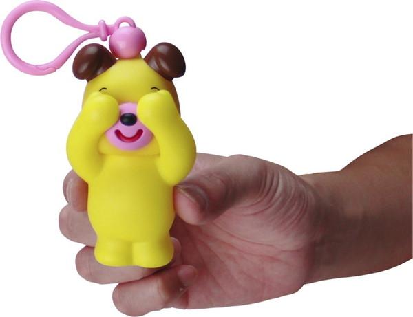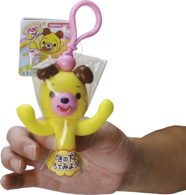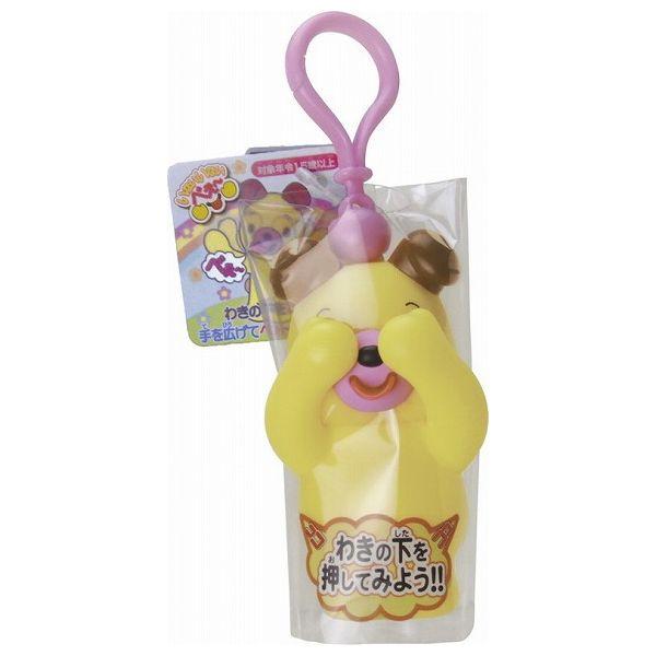 約10cm弱のかわいらしい動物のマスコットにキーホルダーが付いています。「いないいない」のポーズで目を隠していますが、わきの下を押すと、腕を開き、「ばー!」のポーズと同時に舌を出して、「べー」と笛が鳴ります。簡単にかわいらしい「いないいないばー」遊びができる商品です。