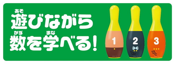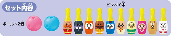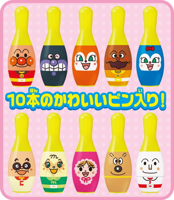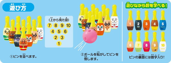 アンパンマンのボウリングセットです。それぞれのピンに違うキャラクターがデザインされています(アンパンマン・ばいきんまん・ドキンちゃん・カレーパンマン・しょくぱんまん・コキンちゃん・あかちゃんまん・めいけんチーズ・メロンパンナ・クリームパンダ)。裏面は数字が入っているので、数のお勉強もできます。
