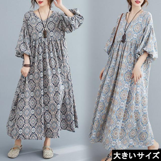 ワンピース バルーンスリーブ ダマスク柄 レディース マキシ エンパイアワンピ 大きいサイズ (zy7059550)
