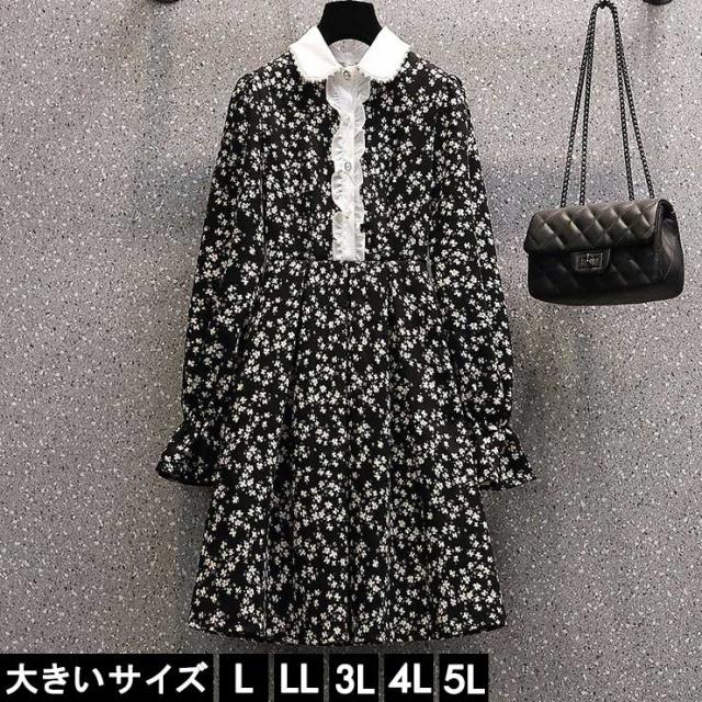 ★☆大きいサイズ レディース 花柄ワンピース 長袖 フレア ビジュー L LL 3L 4L 5L ブラック 10代 20代 30代 11号 13号 15号 17号 19号 新入荷 メール便不可☆★