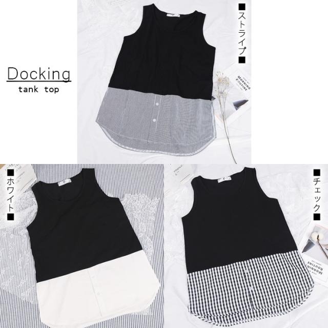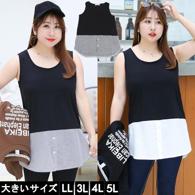 ★☆大きいサイズ レディース 重ね着風タンクトップ ノースリーブシャツ 黒 裾出し LL 3L 4L 5L ホワイト ストライプ チェック 10代 20代 30代 13号 15号 17号 19号 新入荷 メール便可☆★