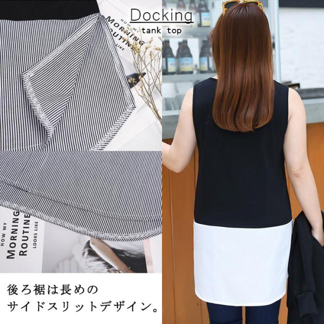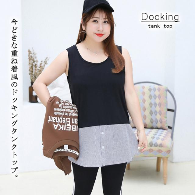 大きいサイズ レディース 重ね着風タンクトップ ノースリーブシャツ 黒 裾出し LL 3L 4L 5L ホワイト ストライプ メール便可 (67860)