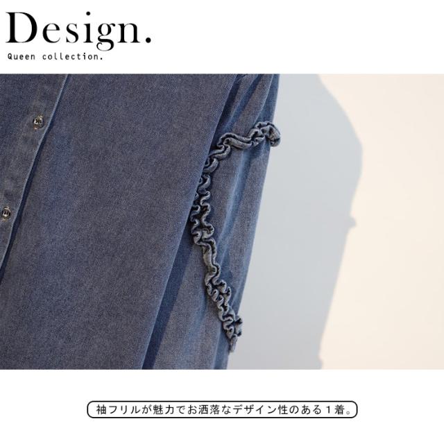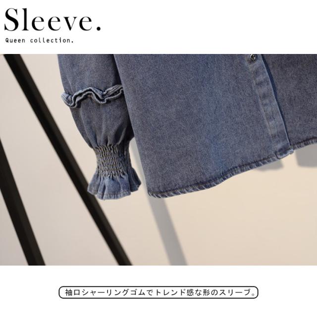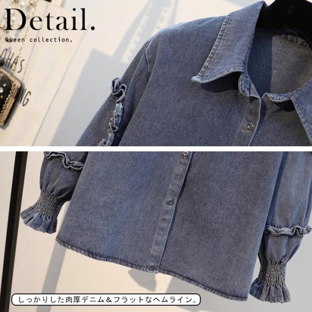 大きいサイズ レディース デニムシャツ 厚手 ジャケット フリル袖トップス 前あき メロー 春 秋 冬 L LL 3L 4L メール便不可 (yf10060)