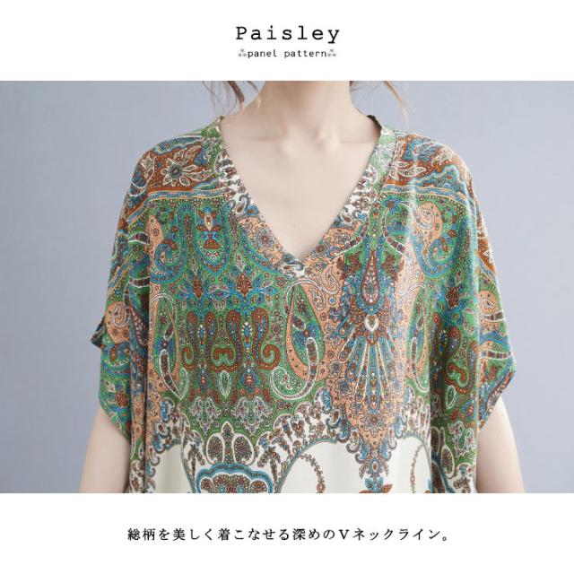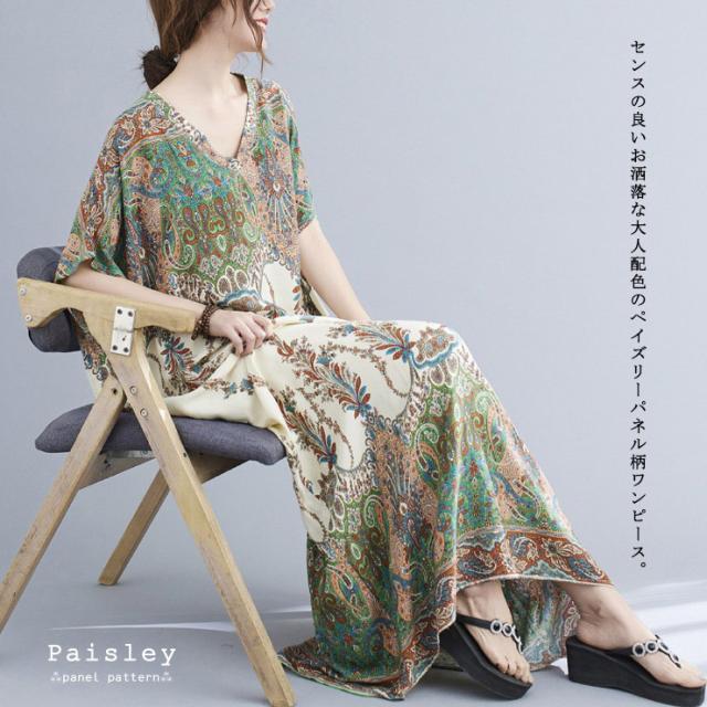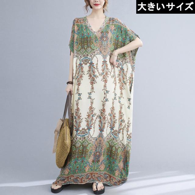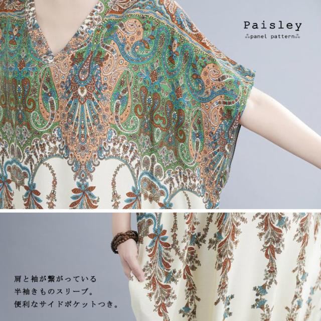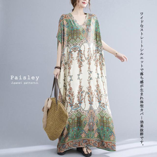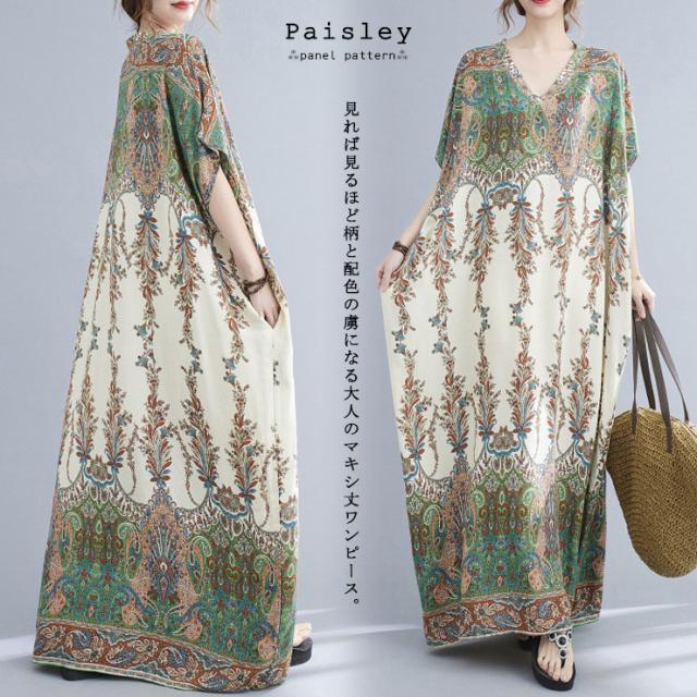 ★☆大きいサイズ レディース マキシワンピース ペイズリー柄 エスニック Vネック LL 3L 4L 5L 6L グリーン 20代 30代 40代 50代 13号 15号 17号 19号 21号 新入荷 メール便可☆★