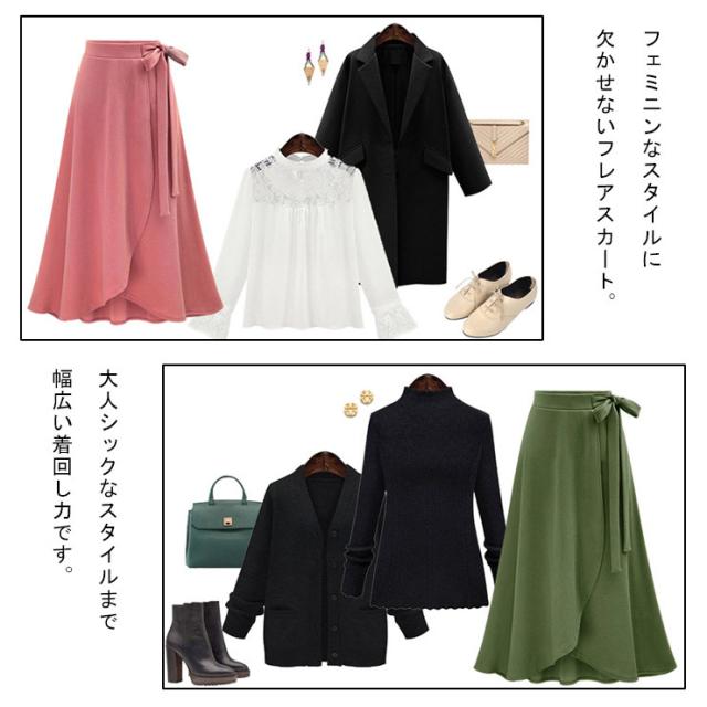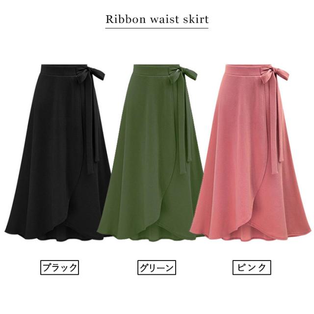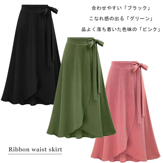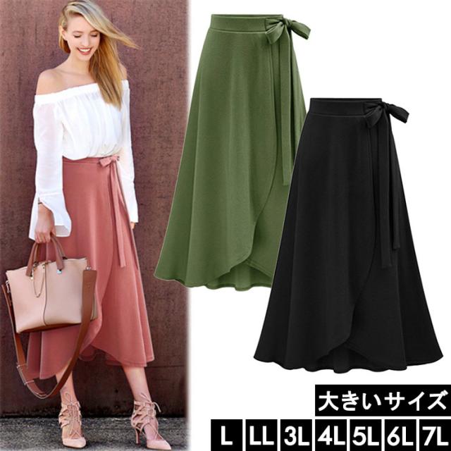 ★☆大きいサイズ レディース ロングスカート フレアスカート 無地 ラップスカート ミモレ丈 リボン L LL 3L 4L 5L 6L 7L ブラック ピンク グリーン 20代 30代 40代 50代 再入荷 メール便不可☆★