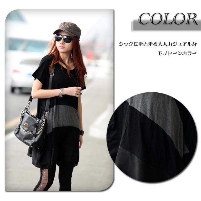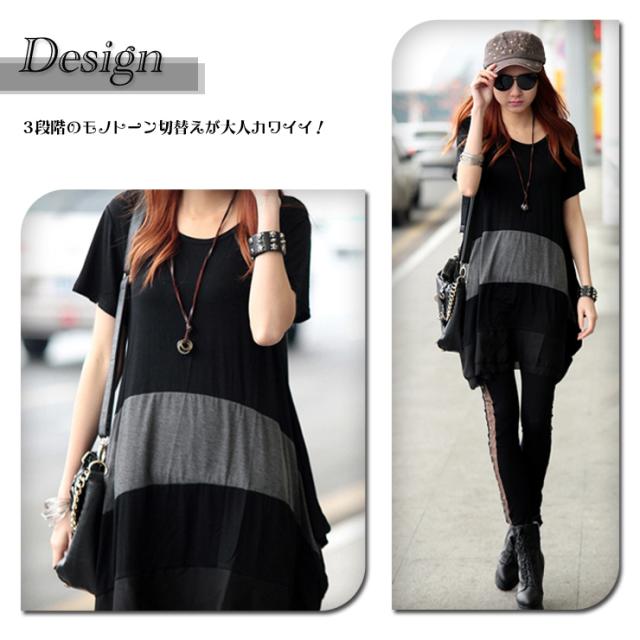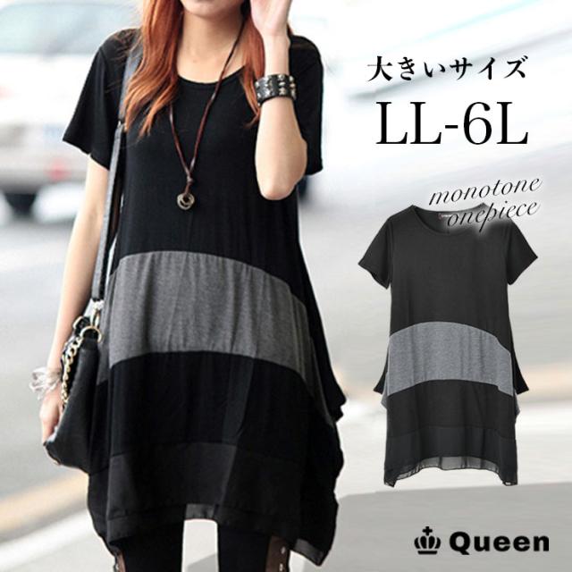 チュニックワンピ 配色ワンピ レディース 半袖 モノトーン 夏服 裾シフォン 大きいサイズ LL 3L 4L 5L 6L (14290)