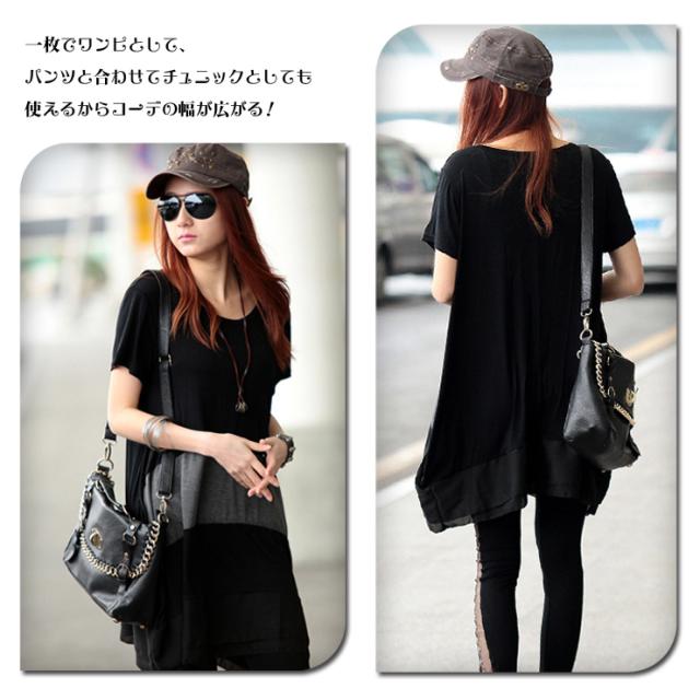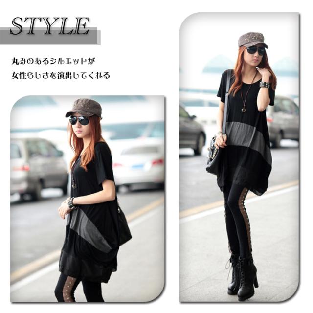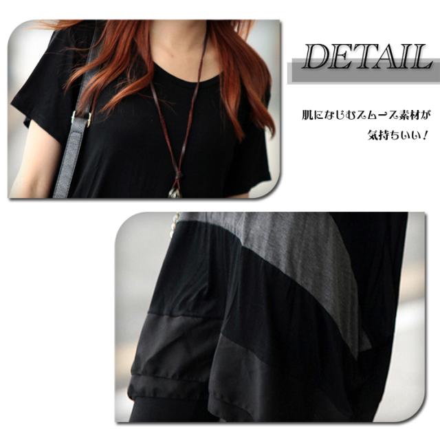 ★☆大きいサイズレディース チュニックワンピ 配色ワンピ 裾シフォン 半袖 モノトーン 夏服 LL 3L 4L 5L 6L ブラック☆★