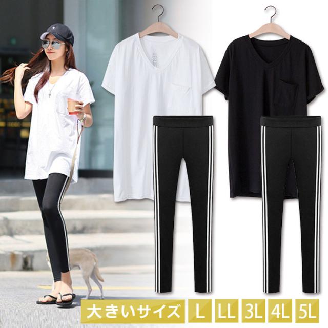 大きいサイズ レディース セットアップ バックロゴTシャツ ライン入りレギンスパンツ 2点セット LL 3L 4L 5L 6L メール便不可 (79014)