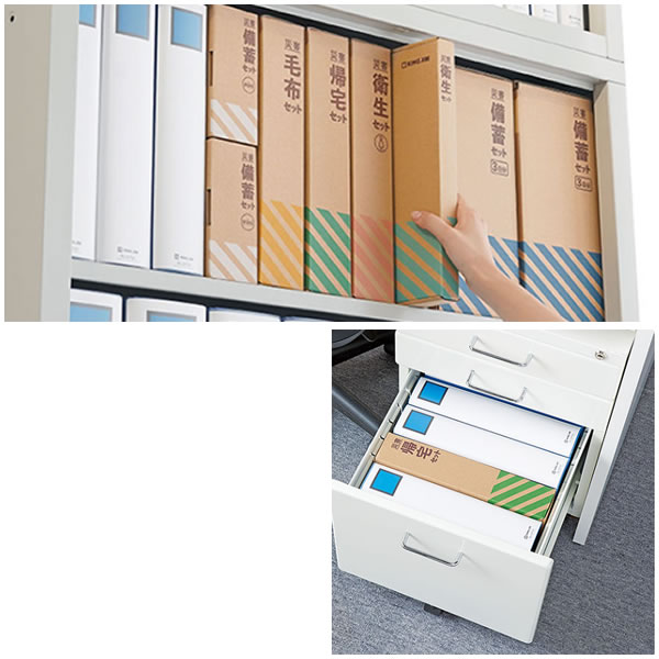 書棚や引き出しに収納しやすく、個人で管理しやすいこの災害対策セットなら、配布の手間が少なく、個人単位で早い対応が可能です。