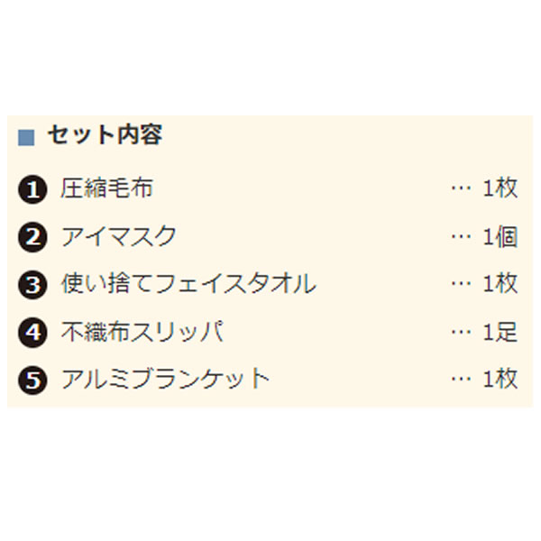 | セット内容 | 1圧縮毛布… 1枚 2アイマスク… 1個 3使い捨てフェイスタオル… 1枚 4不織布スリッパ… 1足 5アルミブランケット… 1枚 |