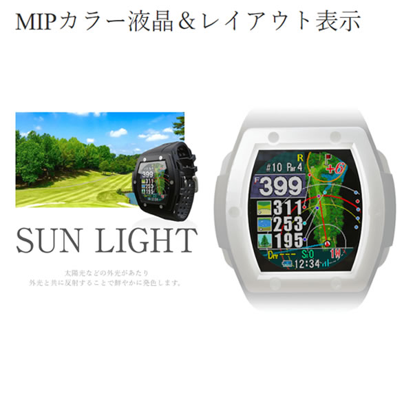 バックライト型カラー液晶や有機ELディスプレイとは違い、ゴルフ場など屋外での高い視認性を実現。