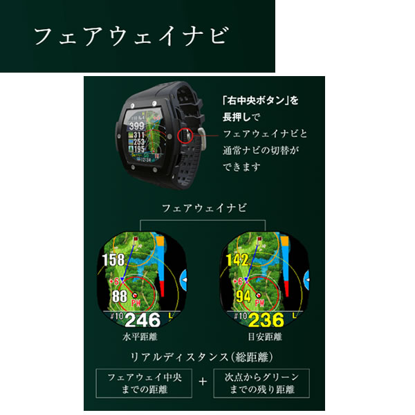 現在地から正面方向のフェアウェイ中央までの距離と高低差、その地点からグリーンまでの距離を案内。 実際に打たなければならない総距離(リアルディスタンス)を表示します。