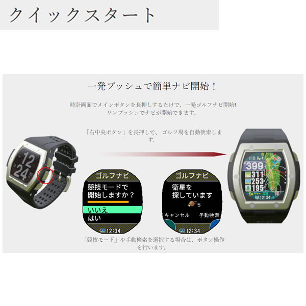 時計画面でメインボタンを長押しするたけで、一発ゴルフナビ開始!