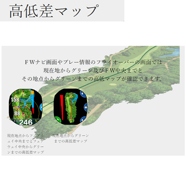 FWナビ画面やプレー情報のフライオーバーの画面では現在地からグリーン及びFW中央までとその地点からグリーンまでの高低マップが確認できます。