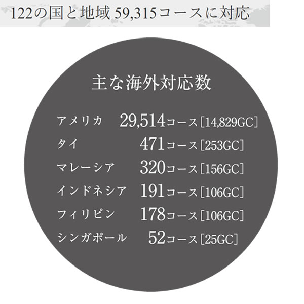 海外のゴルフ場を含めると59,315コースに対応(2020年9月時点)。
