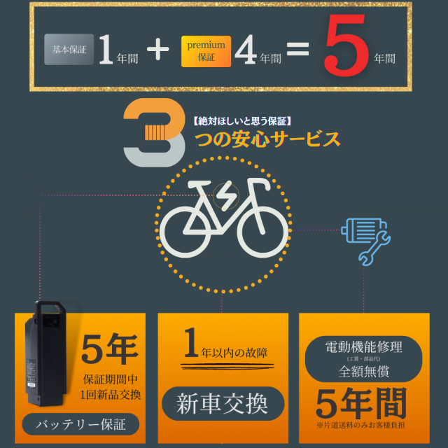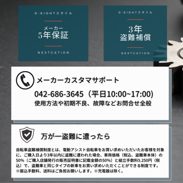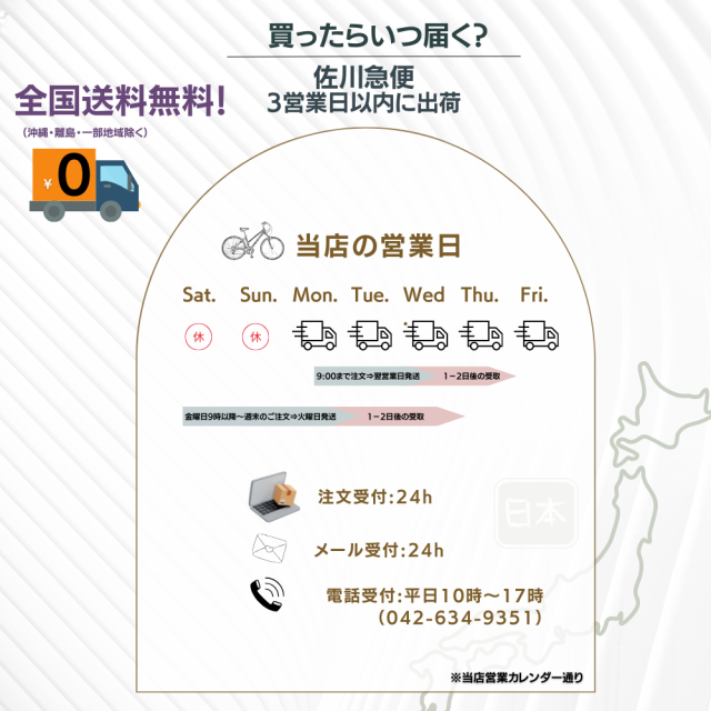 【初期不良・返品について】 出荷完了後の返品はお受付出来かねますので、予めご了承ください。 初期不良を含め全てメーカーサポートによる保証対応となります。 ■カイホウジャパンサポートセンター 電話番号:042-686-3645 ●【自転車取扱店などにて整備士による整備点検を受けてください】 メーカー直送品の場合、自転車の組立・整備はお客様ご自身で行う為、正しく組立・整備されたかについて、 近くの自転車取扱店などにて確認して頂く必要がございます。 大変お手数をお掛け致しますが、使用前の整備調整(組み立て・ブレーキ・チェーンなど)の点検については、 下記防犯登録手続きの際に、必ず近所の自転車取扱店にて点検を受けて頂くことをお勧めします。 ■当店無償加入対象車の場合は、お届け先情報に基づいて防犯登録手続きを行いますので、予めご了承ください。 【その他】 メーカー直送品の為、代引き決済が出来かねます。 |