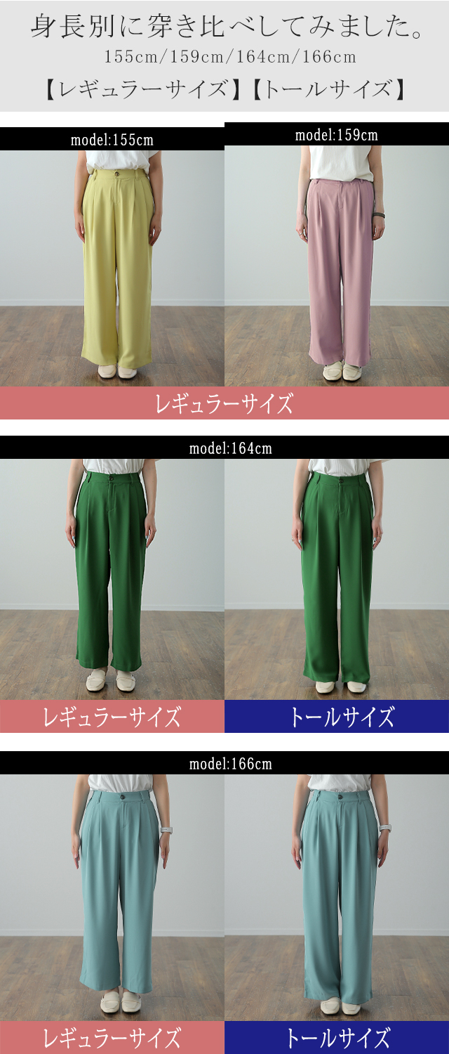 - 168〜9cmで骨盤しっかりめの体型です。 トールタイプ/グリーン買いました。 私の身長でもゆったりめ!長さは引きずることもなくほどよい感じ。トップスインすればすごく脚長に見えます。あまりインしない...