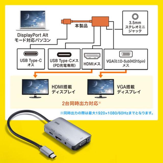 USB Type-C搭載(映像出力に対応したType-Cポートのみ)のパソコンやタブレットからHDMIまたはVGA(ミニD-Sub(HD)15pin)を持つディスプレイやテレビなどに映像出力することができます。USB Type-C接続でのディスプレイ増設「DisplayPort Alternate Mode」に対応するためソフトウェアのインストールなしで簡単にマルチディスプレイ環境(ミラーモード/拡張モード)を実現できます。HDMI出力は4K(3840×2160)/30Hz解像度に対応しており美しく高精細なHDMI信号を出力できます。VGA(ミニD-Dub(HD)15pin)出力は最大1920×1080(1080p)、1920×1200に対応しており、アナログオーディオ出力にも対応しているので映像と音声を同時出力することが可能です。別売りのPD給電対応アダプタ(パソコンに付属するPD用アダプタなど)を接続することで、本製品経由でパソコン本体に充電しながらの映像出力が可能です。※USB Type-Cポートを搭載し、DisplayPort Alternate Modeに対応しているパソコンでご使用いただけます。※USB PD対応機器への充電時は、別途USB PDアダプタをご用意ください。※すべての機器で動作を保証するものではありません。