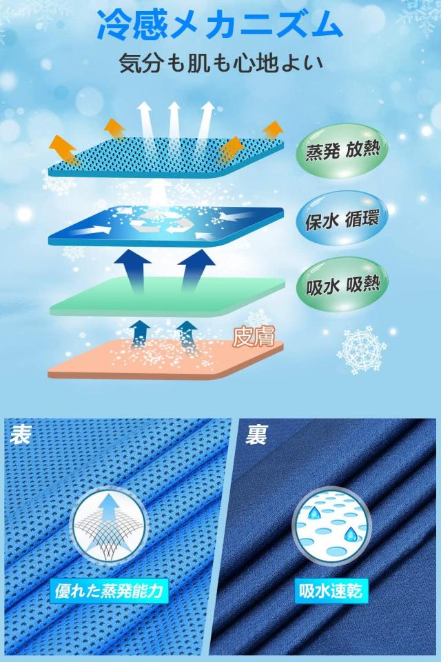 【冷感・ひんやり感長持ち】100%冷却素材で作られており、持続的な冷感性を持っています。3種の生地を使用した特殊製法で、吸湿、水分循環、蒸発の仕組みを実現、気化熱を効果的に発生させます。