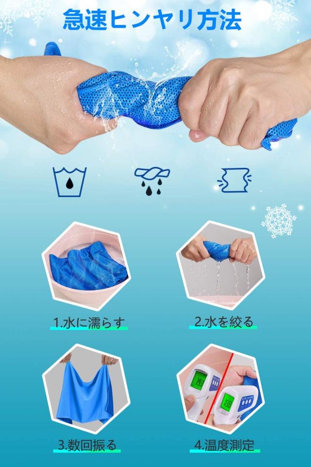 【吸水性抜群・スポーツ汗拭き】冷却タオルは普通のタオルと比べ4倍の吸水力を持っています。たっぷり汗をかいても安心。汗拭きクールタオルとして活用して頂き、清涼を感じたい場合は水で濡らして振るだけでその効果を得られます。