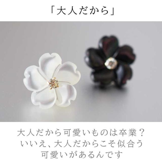 | ほんとは着けたいけど、お花モチーフなんて可愛すぎて...もう卒業しなきゃ、そんな風に思っていませんか? 可愛いものはいくつになってもやっぱり可愛いし、着ければテンションも上がりますよね。 だから...店主自身が一目惚れした、きちんとした場や目上の方に会うことが多い人も使える、シンプルなひと粒ダイヤモンドピアスとお花の2Wayピアスです! お花の素材は上品な黒蝶貝・白蝶貝を使用、シンプルな形ながら艶やかな照りが上品に光ります。もちろん、お手持ちのピアスとお花を組み合わせて使うことも可能♪ 1か月無料修理保証もついた「品質保証書」&ギフトラッピングつきなので、プレゼントにもおすすめです♥ |